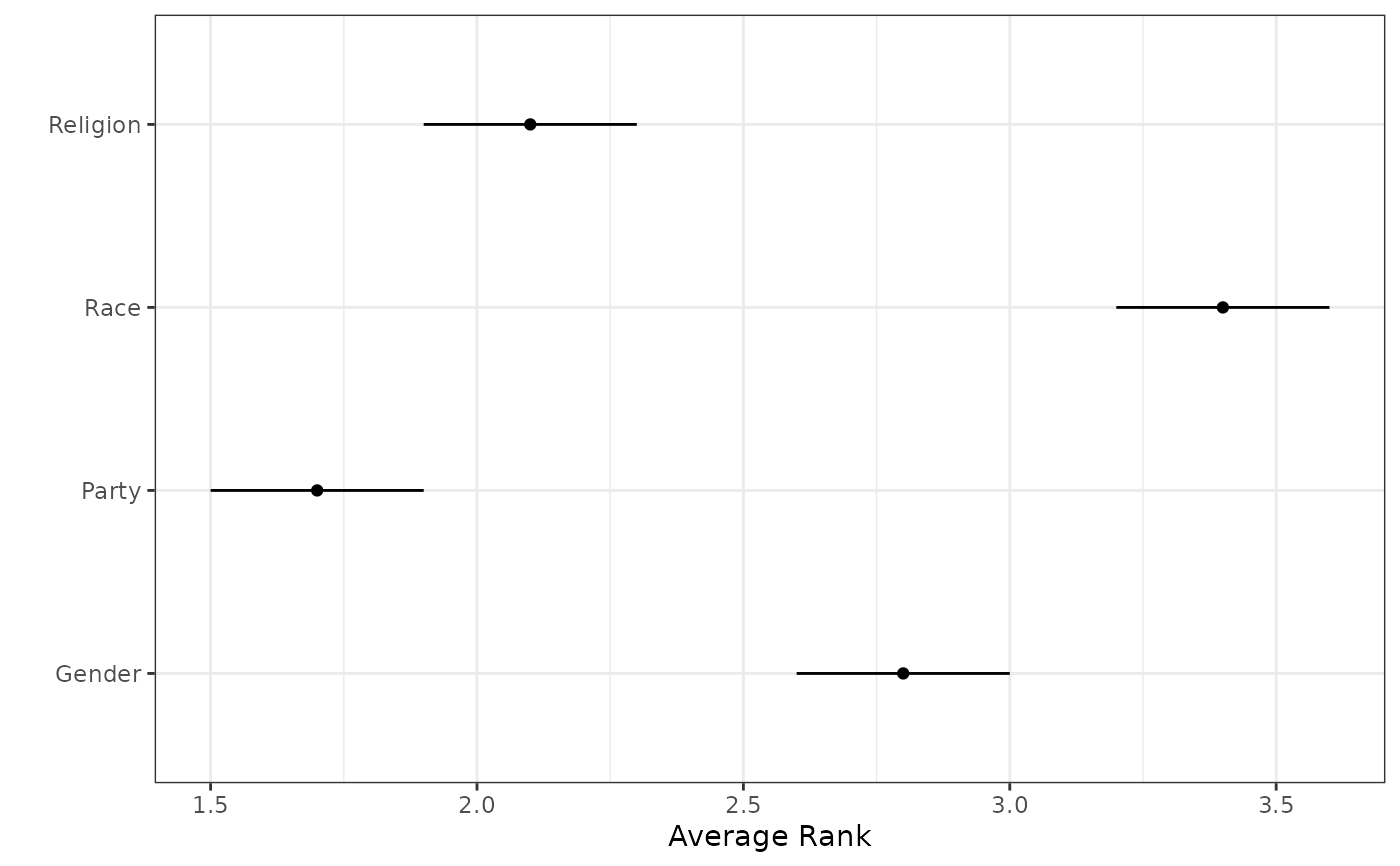 This function takes the output from the `imprr_direct` function and plots the average rank results with confidence intervals. As long as the mean and the confidence intervals are provided, this function will plot other quantities of interest such as marginal, pairwise, top-k rankings.